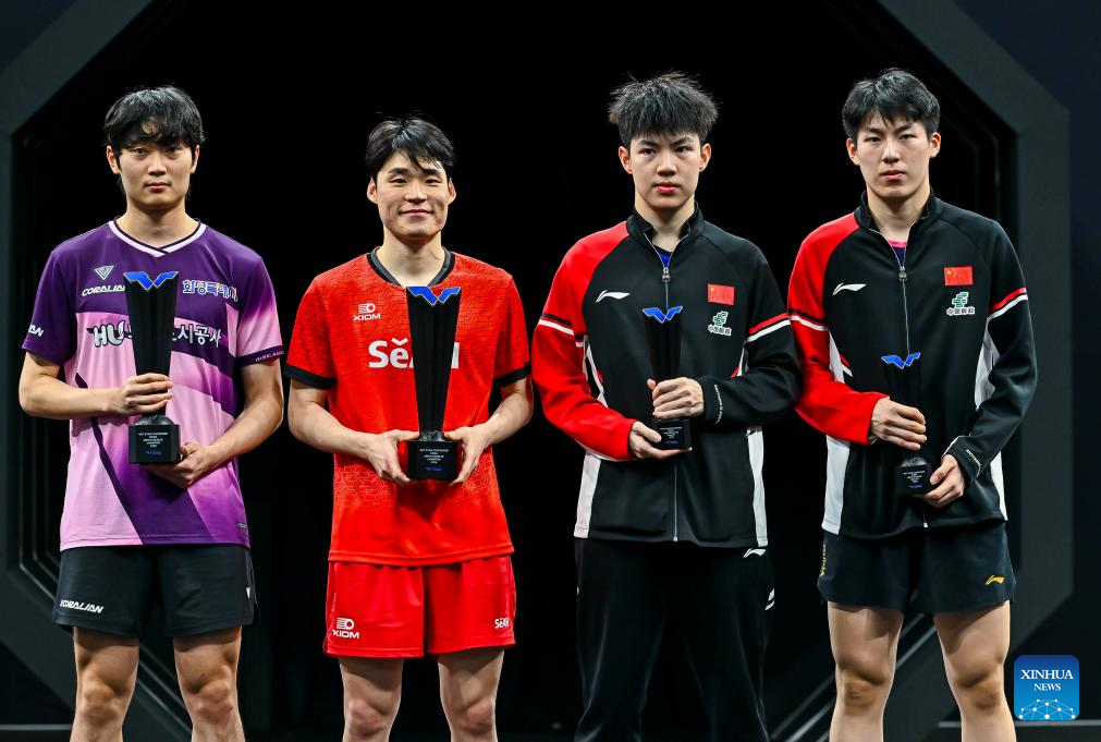 Gold medalists Jang Woojin (2nd L)/Cho Daeseong (1st L) of South Korea and silver medalists Huang Youzheng (2nd R)/Wen Ruibo of China pose for photos during the awarding ceremony after the men's doubles final match at WTT Star Contender Doha 2026 in Doha, Qatar, Jan. 17, 2026. (Photo by Nikku/Xinhua)