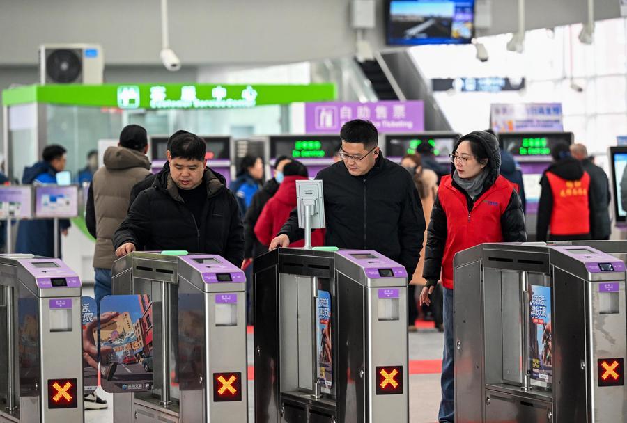 Passengers walk through ticket gates at Beitang Station of Tianjin Rail Transit Line Z4 in north China's Tianjin, on Jan. 18, 2026. (Xinhua/Zhao Zishuo)