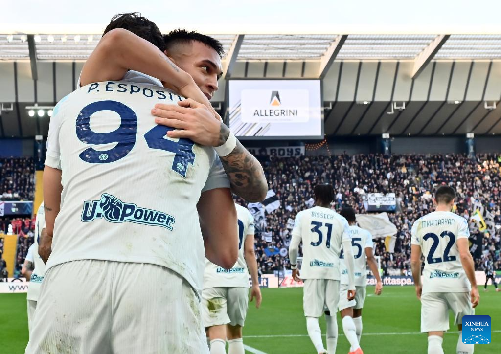 Inter Milan's Lautaro Martinez (2nd L) celebrates his goal with his teammate Pio Espositob (1st L) during a Serie A football match between Udinese and Inter Milan in Udine, Italy, Jan.17, 2026. (Photo by Diego Petrussi/Xinhua)