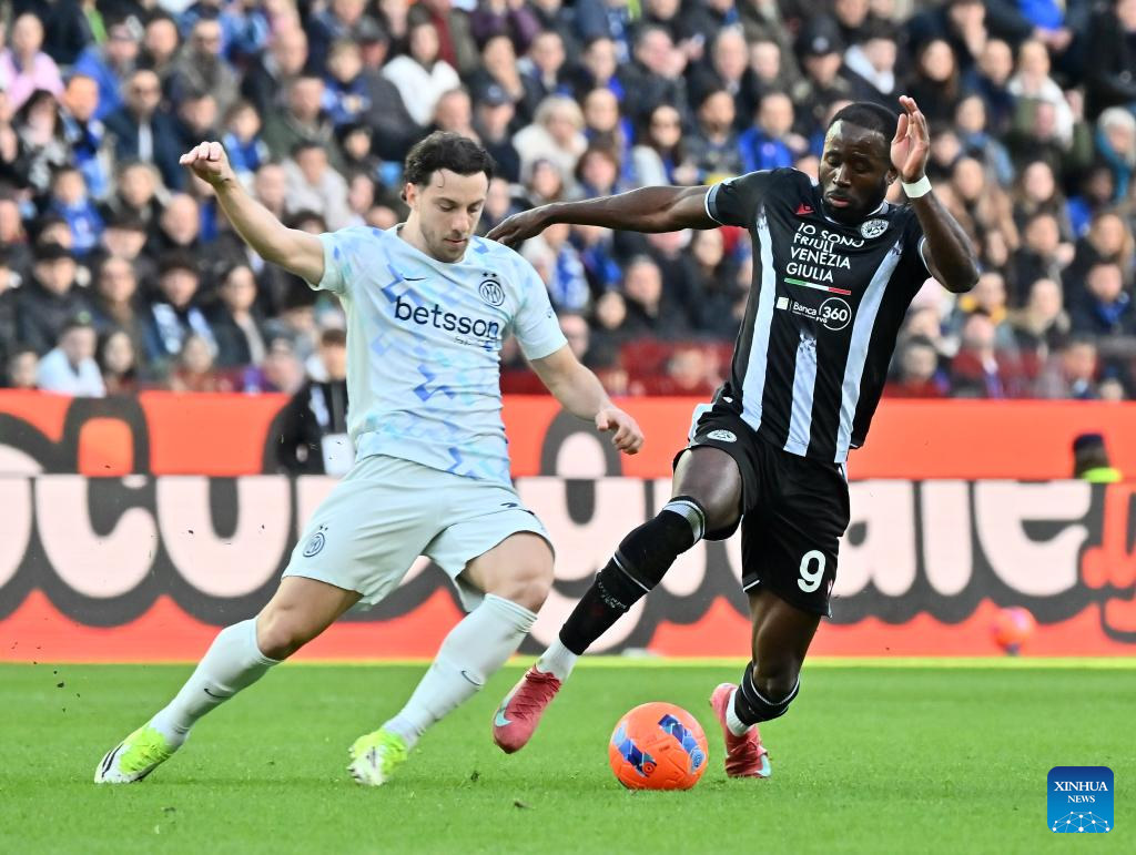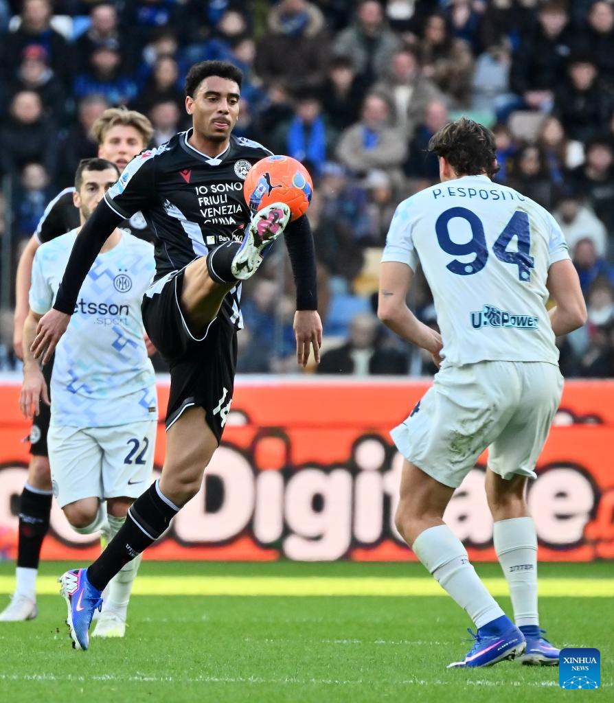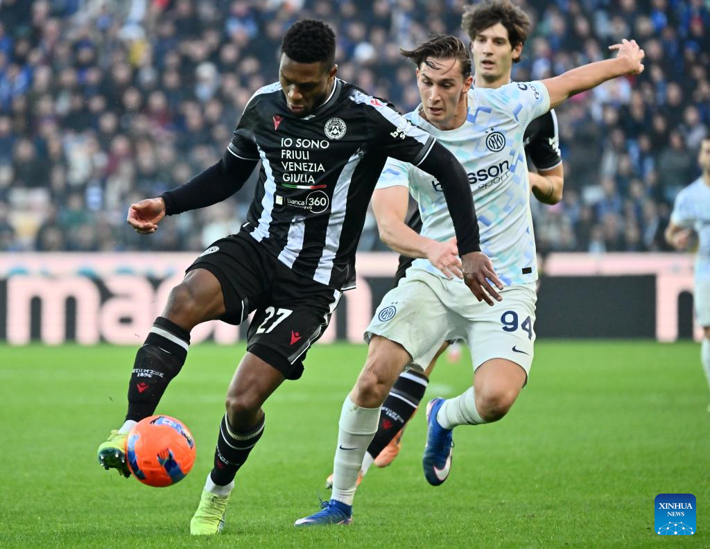 Inter Milan's Pio Esposito (R) vies with Udinese's Arthur Atta (L) during a Serie A football match between Udinese and Inter Milan in Udine, Italy, Jan.17, 2026. (Photo by Diego Petrussi/Xinhua)