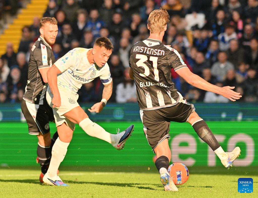 Inter Milan's Lautaro Martinez (C) scores during a Serie A football match between Udinese and Inter Milan in Udine, Italy, Jan.17, 2026. (Photo by Diego Petrussi/Xinhua)