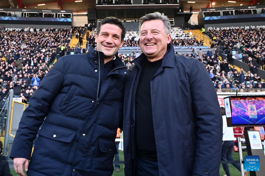 Inter Milan's head coach Cristian Chivu (L) and Udinese's head coach Kosta Runjaic pose for a photo during a Serie A football match between Udinese and Inter Milan in Udine, Italy, Jan.17, 2026. (Photo by Diego Petrussi/Xinhua)