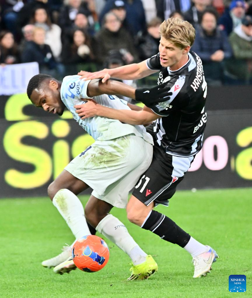 Inter Milan's Ange-Yoan Bonny (L) vies with Udinese's Thomas Kristensen during a Serie A football match between Udinese and Inter Milan in Udine, Italy, Jan.17, 2026. (Photo by Diego Petrussi/Xinhua)
