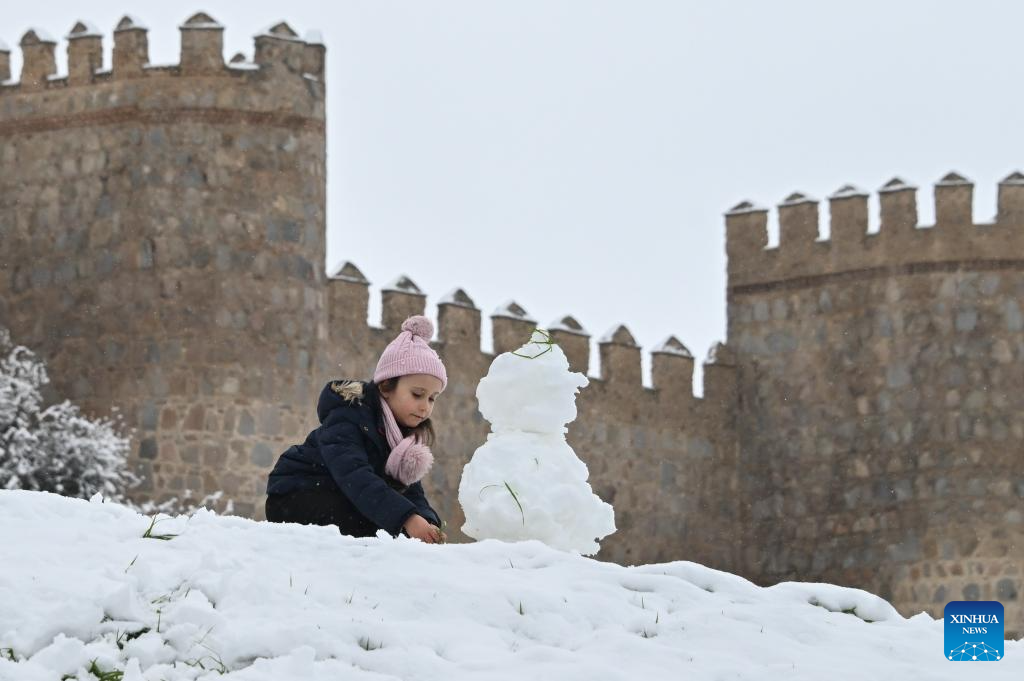 A girl enjoys herself after snow outside the ancient city wall of Avila, Spain, on Jan. 17, 2026. Avila is renowned as a UNESCO World Heritage Site for its well-preserved medieval walls, built in the 11th century and stretching about 2.5 kilometers. (Xinhua/Cheng Min)