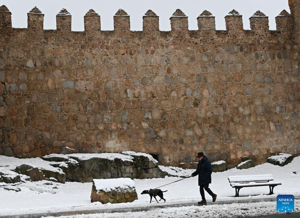 A man walks his dog after snow outside the ancient city wall of Avila, Spain, on Jan. 17, 2026. Avila is renowned as a UNESCO World Heritage Site for its well-preserved medieval walls, built in the 11th century and stretching about 2.5 kilometers. (Xinhua/Cheng Min)
