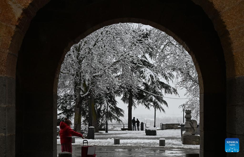 This photo taken on Jan. 17, 2026 shows a view of the snow-covered Avila, Spain. Avila is renowned as a UNESCO World Heritage Site for its well-preserved medieval walls, built in the 11th century and stretching about 2.5 kilometers. (Xinhua/Cheng Min)