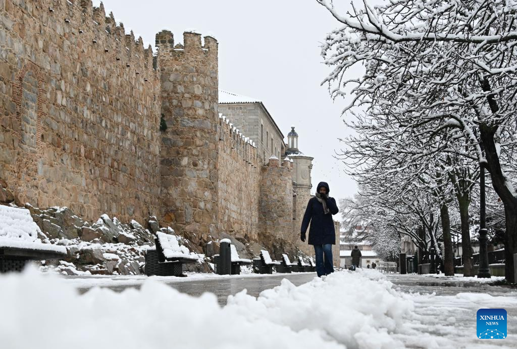 A man walks on the street after snow outside the ancient city wall of Avila, Spain, on Jan. 17, 2026. Avila is renowned as a UNESCO World Heritage Site for its well-preserved medieval walls, built in the 11th century and stretching about 2.5 kilometers. (Xinhua/Cheng Min)