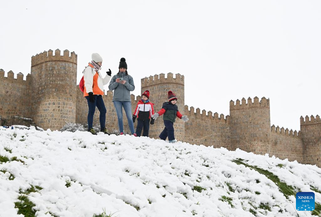 People enjoy themselves after snow outside the ancient city wall of Avila, Spain, on Jan. 17, 2026. Avila is renowned as a UNESCO World Heritage Site for its well-preserved medieval walls, built in the 11th century and stretching about 2.5 kilometers. (Xinhua/Cheng Min)
