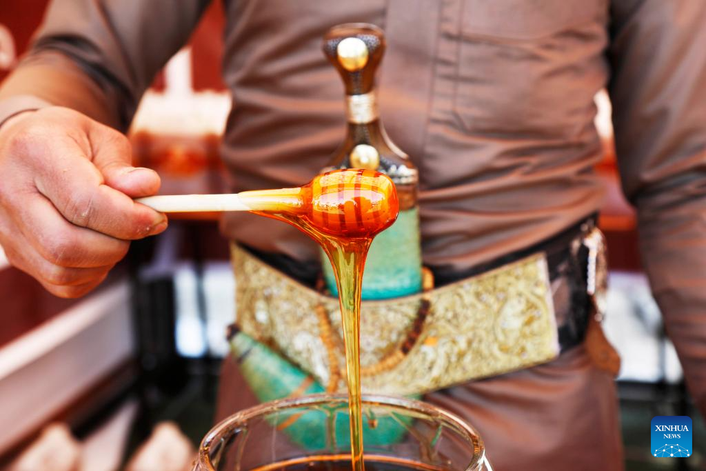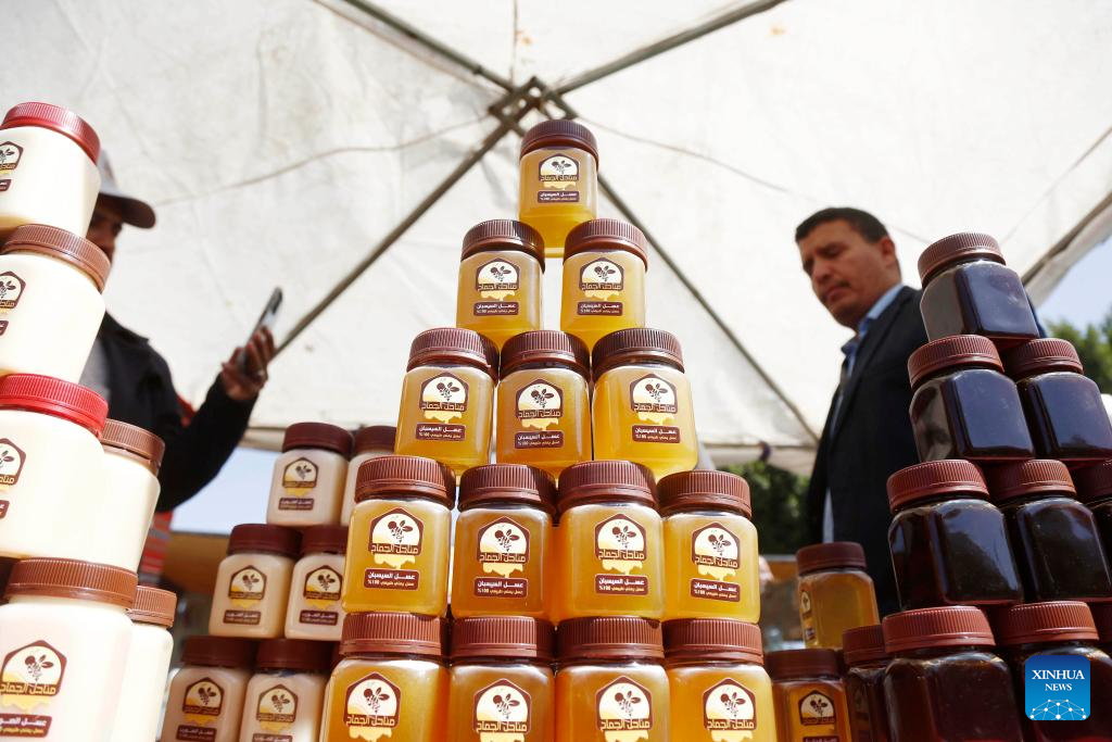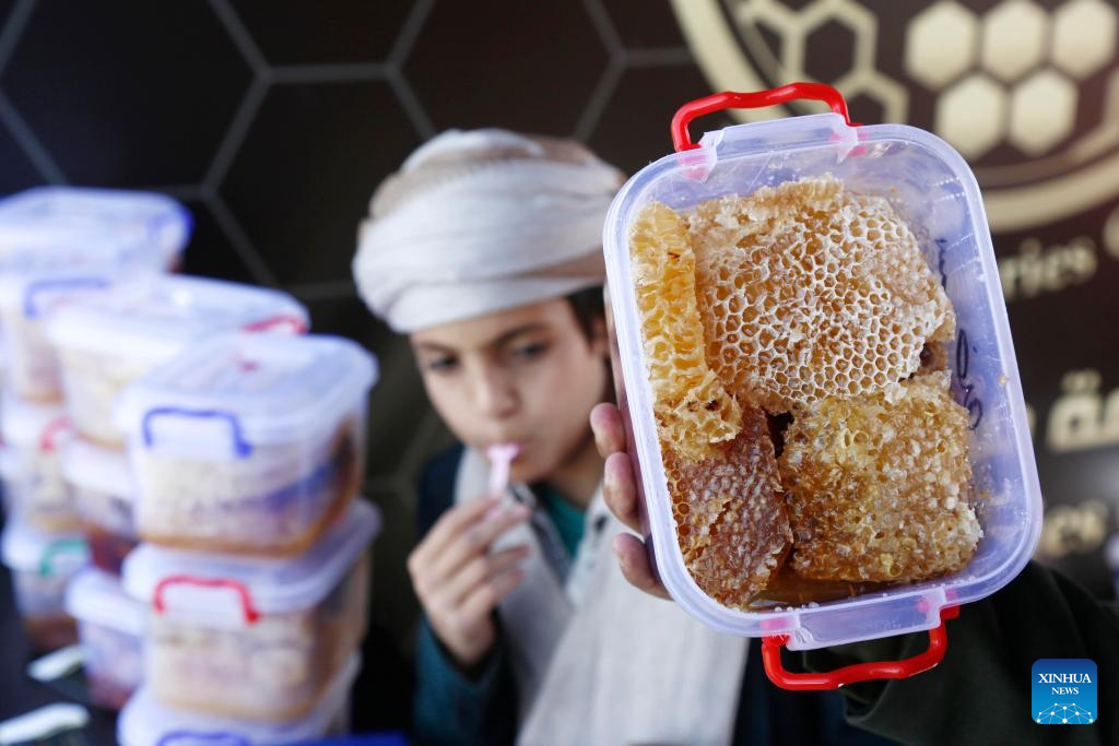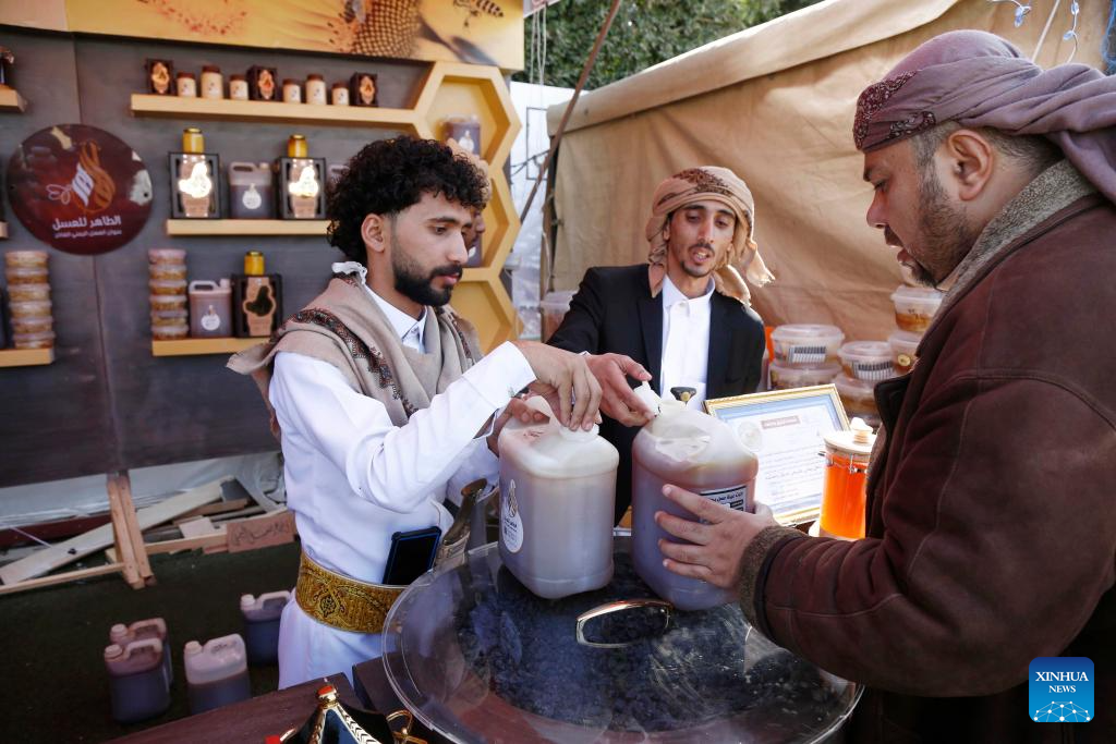 A customer checks the quality of honey to buy during the annual Yemeni honey festival in Sanaa, Yemen, on Jan. 17, 2026. The annual Yemeni honey festival themed "Yemen, the Home of Honey," was held in Sanaa on Saturday, aiming to uphold its status as one of the nation's most significant products, valued for its nutrition and economic benefits. (Photo by Mohammed Mohammed/Xinhua)