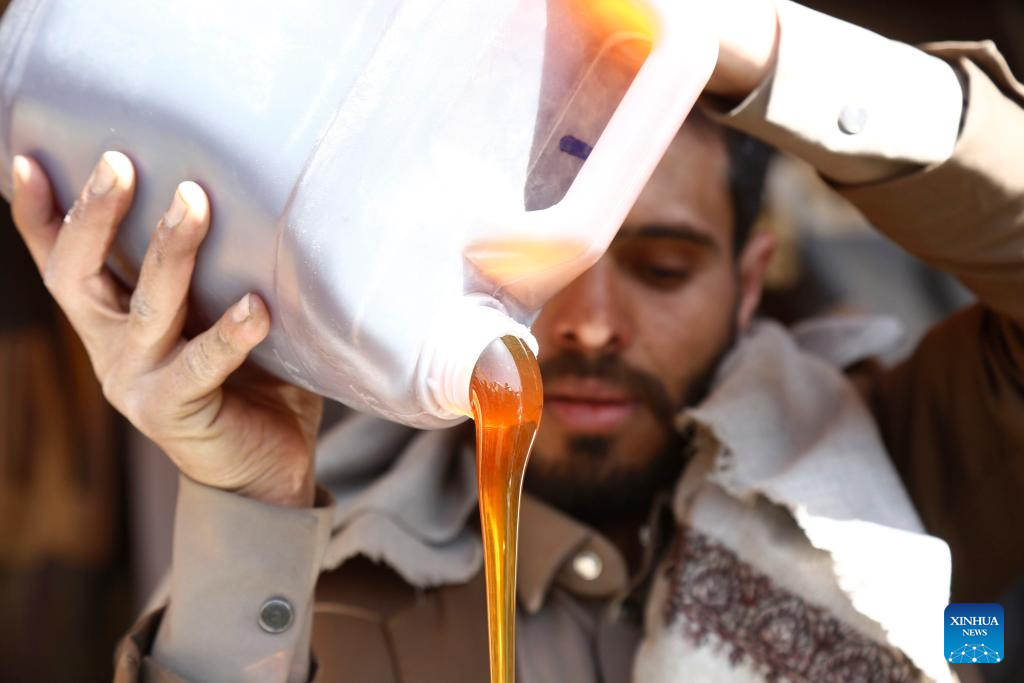 A seller pours honey into a jerrycan during the annual Yemeni honey festival in Sanaa, Yemen, on Jan. 17, 2026. The annual Yemeni honey festival themed "Yemen, the Home of Honey," was held in Sanaa on Saturday, aiming to uphold its status as one of the nation's most significant products, valued for its nutrition and economic benefits. (Photo by Mohammed Mohammed/Xinhua)