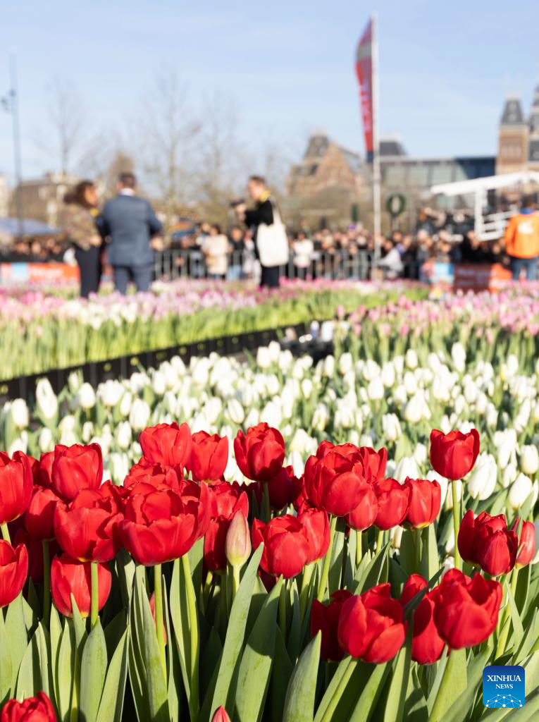This photo taken on Jan. 17, 2026 shows a view of a huge picking garden with more than 200,000 tulips on the Museum Square in Amsterdam, the Netherlands. The Dutch celebrated the annual National Tulip Day, which is traditionally marked on the third Saturday of the year. (Photo by Sylvia Lederer/Xinhua)