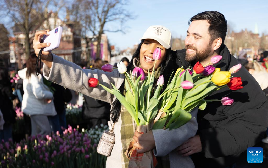 People take selfies at a huge picking garden with more than 200,000 tulips on the Museum Square in Amsterdam, the Netherlands, Jan. 17, 2026. The Dutch celebrated the annual National Tulip Day, which is traditionally marked on the third Saturday of the year. (Photo by Sylvia Lederer/Xinhua)