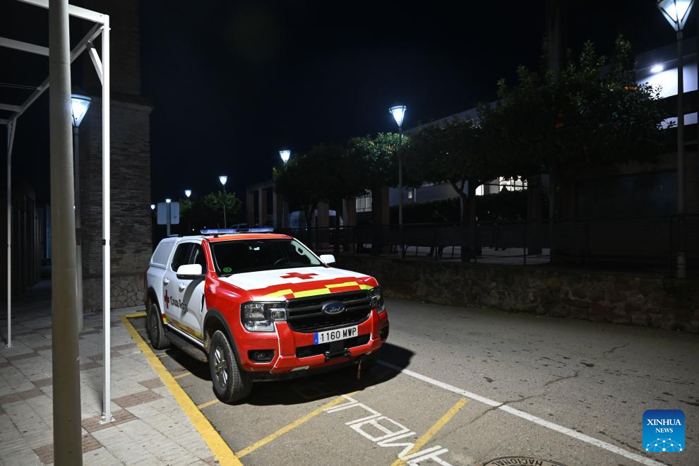 A rescue car is seen parking near a resettlement site in Adamuz, Spain, Jan. 19, 2026. Death toll from the derailment of two high-speed trains in Spain has risen to 39, according to local media reports. (Xinhua/Cheng Min)