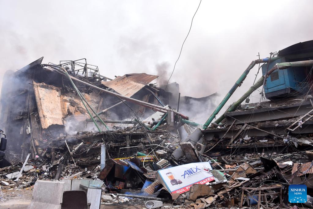 This photo taken on Jan. 19, 2026 shows the fire site at a shopping mall in Karachi, Pakistan. The death toll from a fire at a shopping mall in Pakistan's southern port city of Karachi rose to 14 on Monday morning after rescue teams recovered more bodies during a search operation, officials said. (Str/Xinhua)