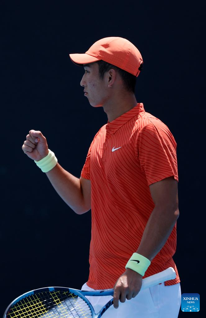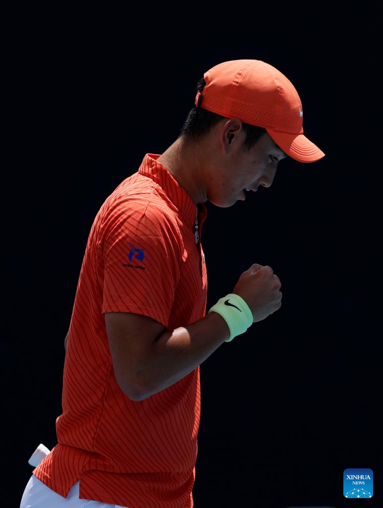 Shang Juncheng of China celebrates scoring during the men's singles 1st round match against Roberto Bautista Agut of Spain at the Australian Open tennis tournament in Melbourne, Australia, Jan. 19, 2026. (Xinhua/Ma Ping)