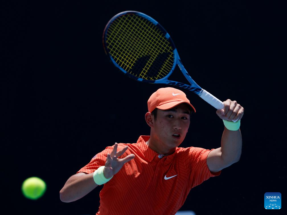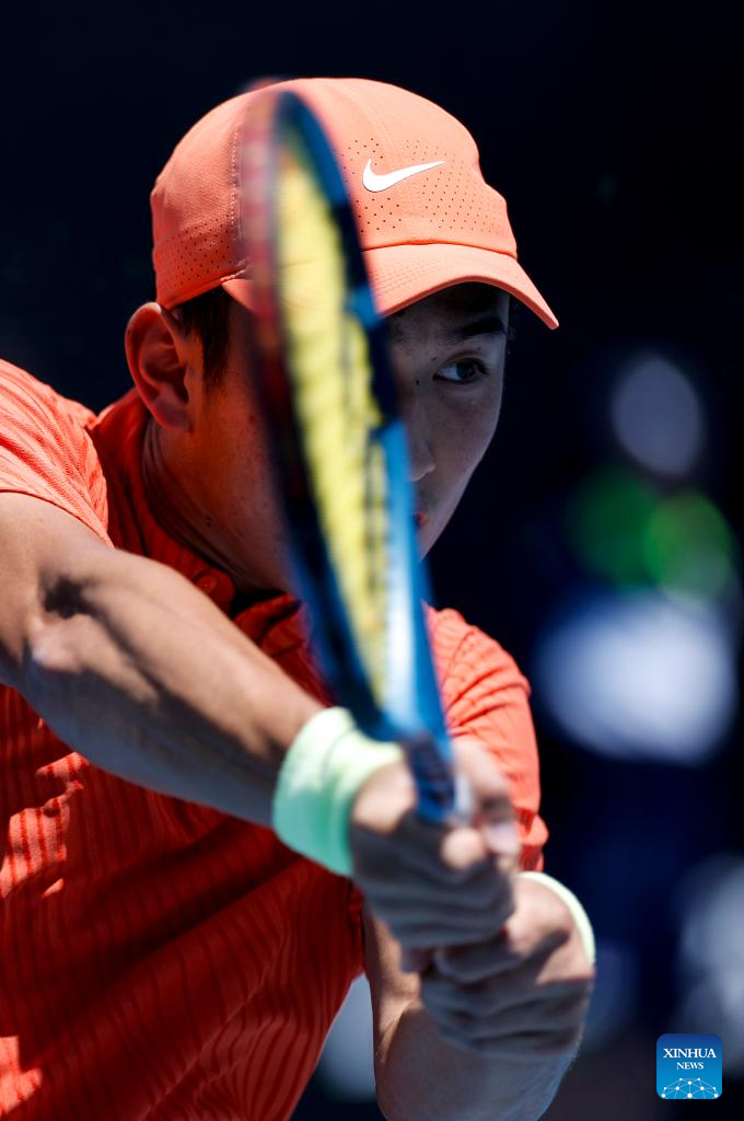Shang Juncheng of China hits a return during the men's singles 1st round match against Roberto Bautista Agut of Spain at the Australian Open tennis tournament in Melbourne, Australia, Jan. 19, 2026. (Xinhua/Ma Ping)