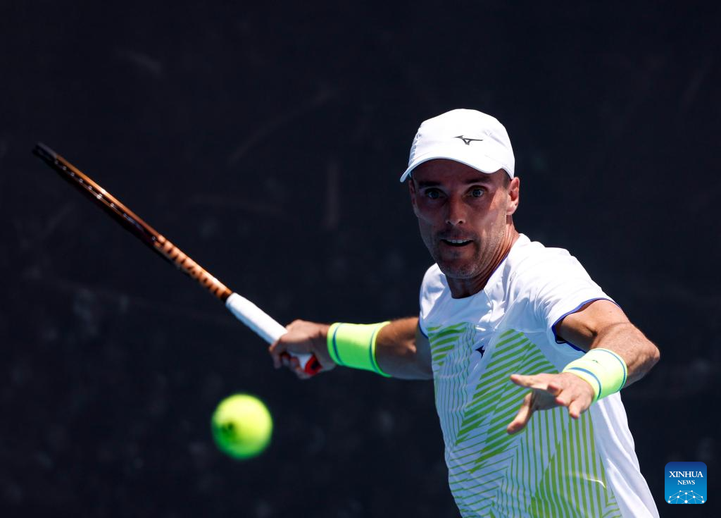 Roberto Bautista Agut of Spain hits a return during the men's singles 1st round match against Shang Juncheng of China at the Australian Open tennis tournament in Melbourne, Australia, Jan. 19, 2026. (Xinhua/Ma Ping)