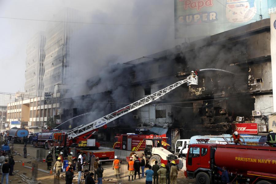 ISLAMABAD, Jan. 19 (Xinhua) -- The death toll from a fire at a shopping mall in Pakistan's southern port city of Karachi rose to 14 on Monday morning after rescue teams recovered more bodies during a search operation, officials said.