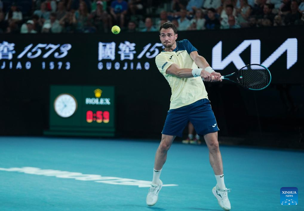 Pedro Martinez hits a return during the men's singles 1st round match between Pedro Martinez of Spain and Novak Djokovic of Serbia at the Australian Open tennis tournament in Melbourne, Australia, Jan. 19, 2026. (Photo by Wang Shen/Xinhua)