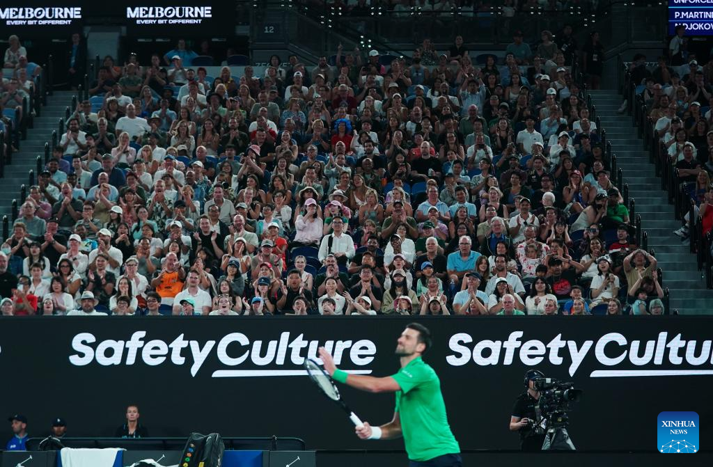 The audience applauds during the men's singles 1st round match between Pedro Martinez of Spain and Novak Djokovic of Serbia at the Australian Open tennis tournament in Melbourne, Australia, Jan. 19, 2026. (Photo by Wang Shen/Xinhua)