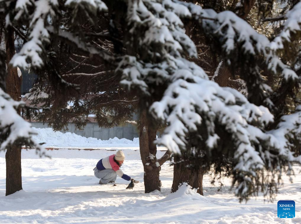 People have fun in a street after snow in Bishkek, Kyrgyzstan, Jan. 18, 2026. (Photo by Roman/Xinhua)
