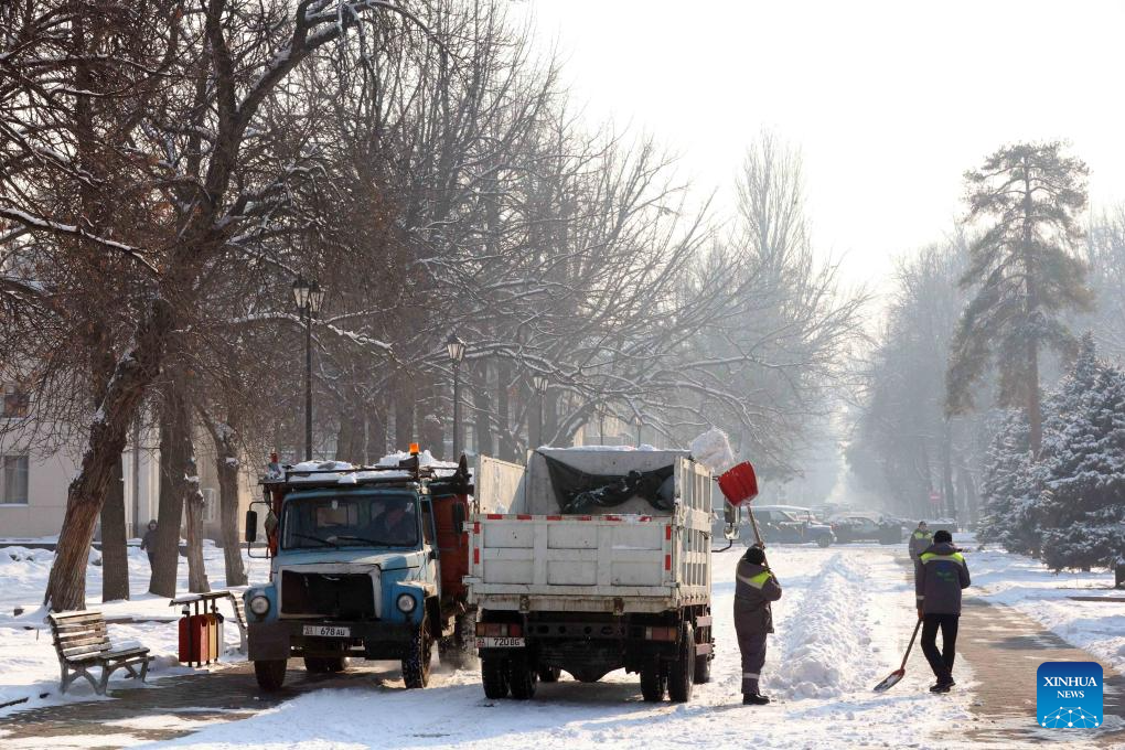 Workers clear a snow-covered street in Bishkek, Kyrgyzstan, Jan. 18, 2026. (Photo by Roman/Xinhua)