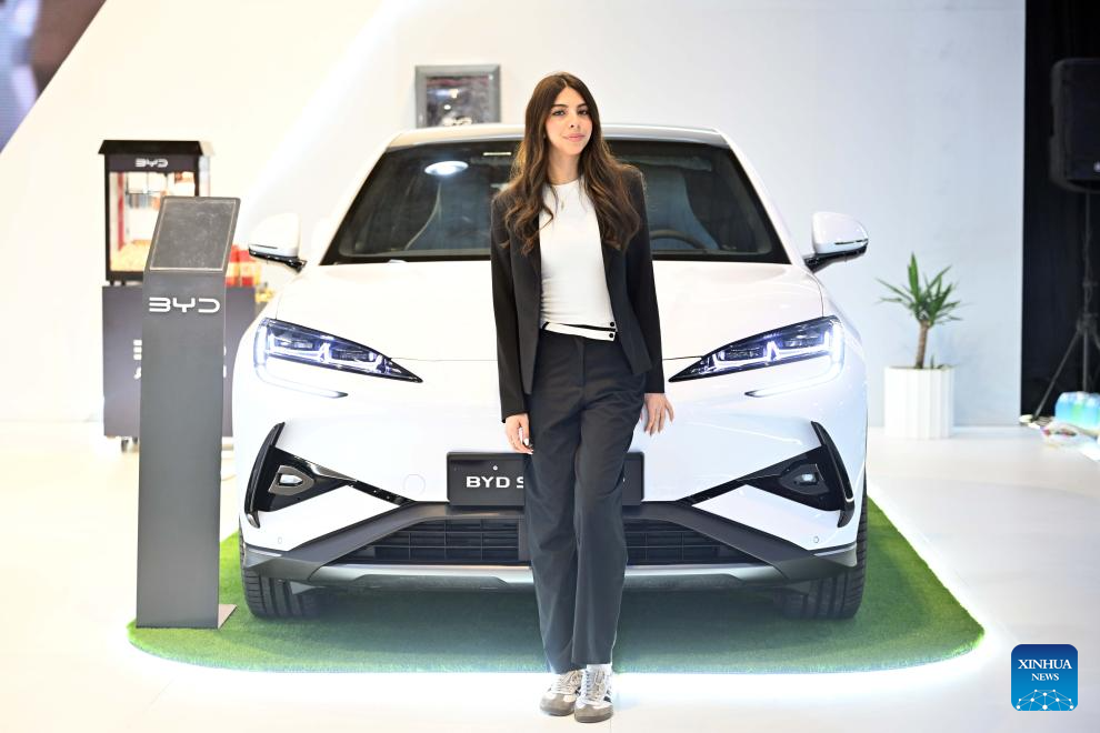 A model takes a photo at the booth of Chinese car brand BYD during the Auto Show in Hawalli Governorate, Kuwait, Jan. 19, 2026. The Auto Show kicked off in Kuwait's Hawalli Governorate on Monday with the participation of more than 120 cars from around 30 car dealers showing 40 car brands. The event will last for 6 days from Jan. 19 to 24. (Photo by Asad/Xinhua)