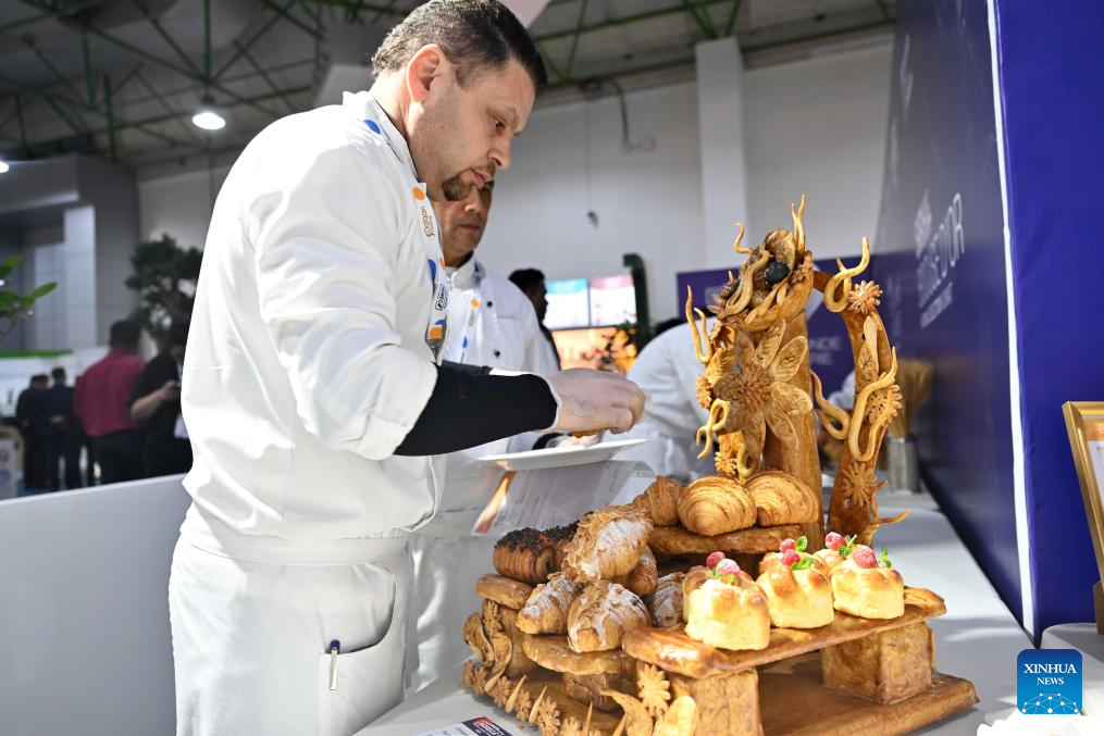 A cook prepares food during the HORECA Kuwait 2026 exhibition in Hawalli Governorate, Kuwait, Jan. 19, 2026. The exhibition was launched here on Monday and will continue until Jan. 21. HORECA is a combination of the words HO (hotels), RE (restaurants) and CA (cafes). (Photo by Asad/Xinhua)