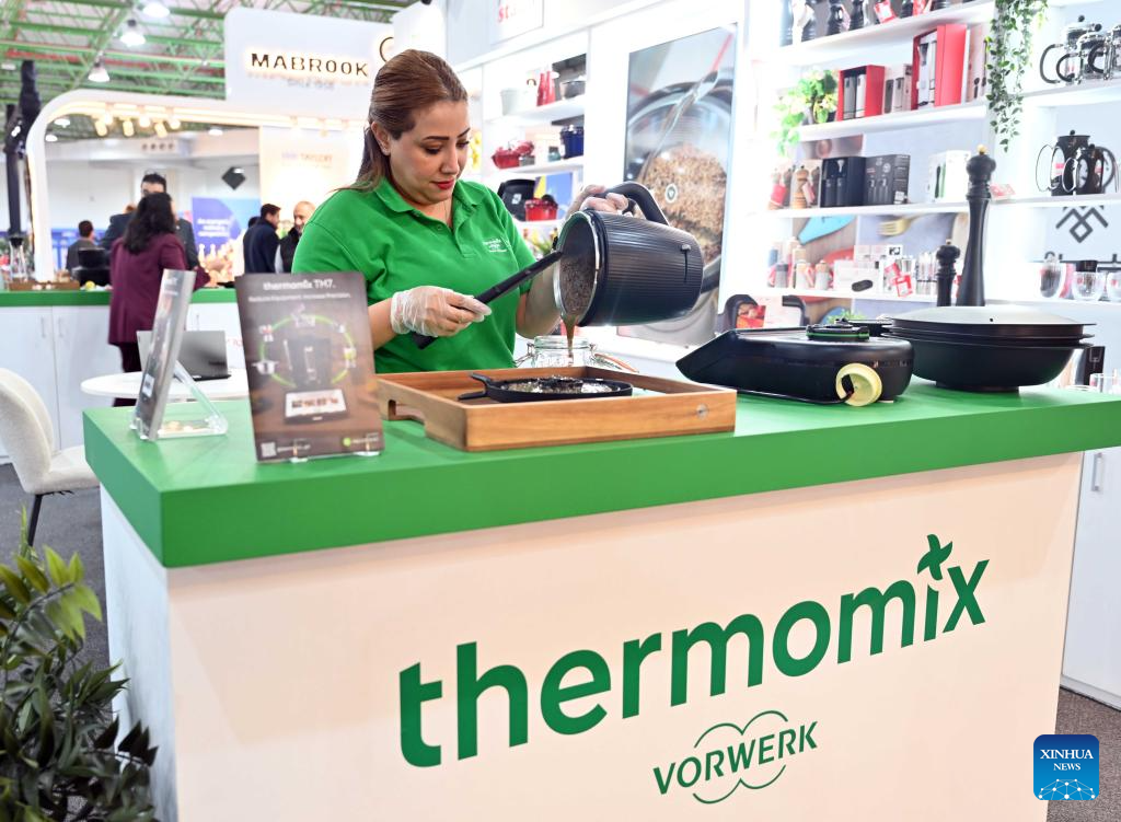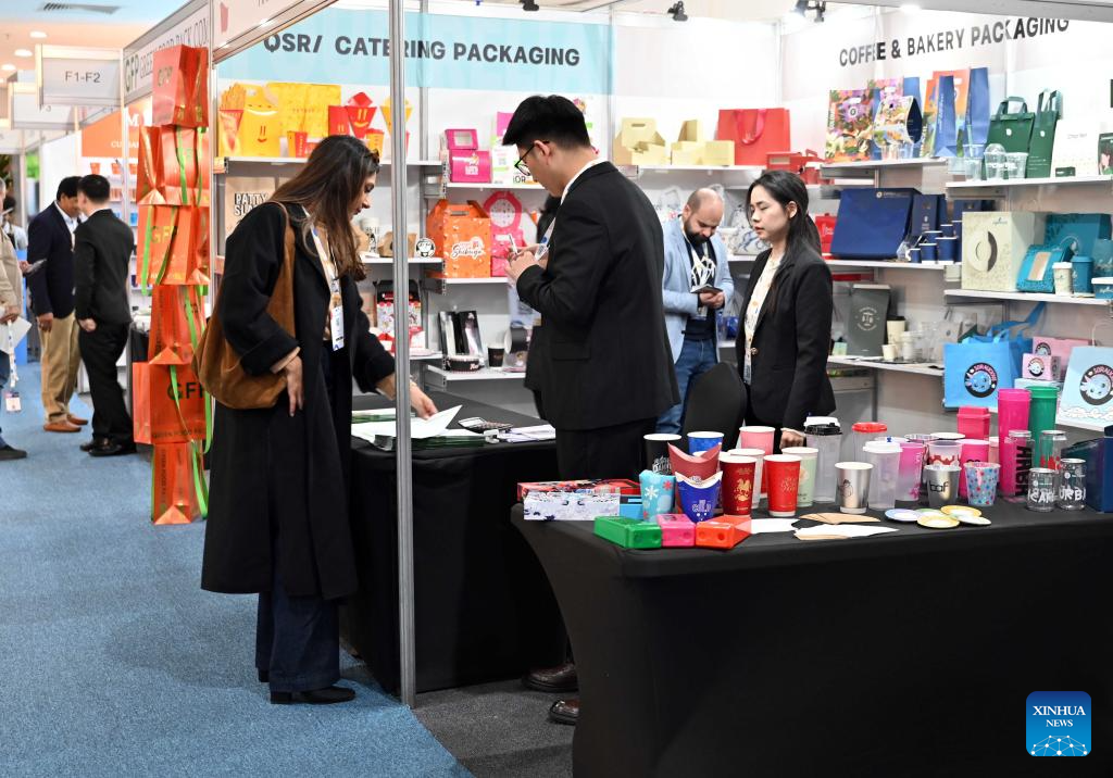 Staff members work at a booth during the HORECA Kuwait 2026 exhibition in Hawalli Governorate, Kuwait, Jan. 19, 2026. The exhibition was launched here on Monday and will continue until Jan. 21. HORECA is a combination of the words HO (hotels), RE (restaurants) and CA (cafes). (Photo by Asad/Xinhua)