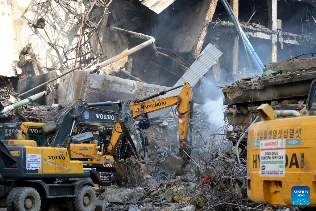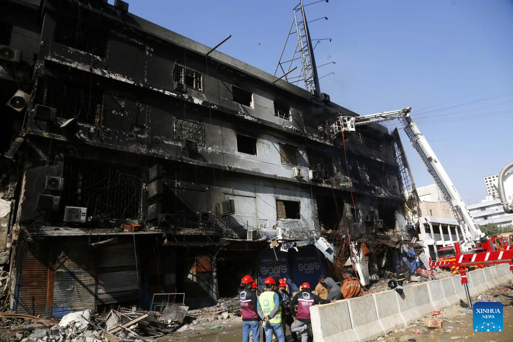 Rescuers work at the fire site of a shopping mall in Karachi, Pakistan, Jan. 19, 2026. The death toll from a massive fire at a multi-story commercial building in Pakistan's southern port city of Karachi has risen to 26, while 74 people are still missing, officials said on Tuesday. (Xinhua)