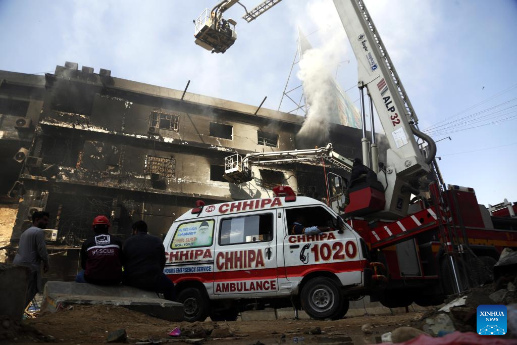 Rescuers and ambulances are seen at the fire site of a shopping mall in Karachi, Pakistan, Jan. 19, 2026. The death toll from a massive fire at a multi-story commercial building in Pakistan's southern port city of Karachi has risen to 26, while 74 people are still missing, officials said on Tuesday. (Xinhua)