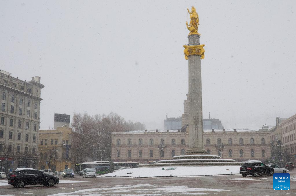 Photo taken on Jan. 19, 2026 shows snow covered Freedom Square in Tbilisi, capital of Georgia. (Photo by Alexander Imedashvili/Xinhua)