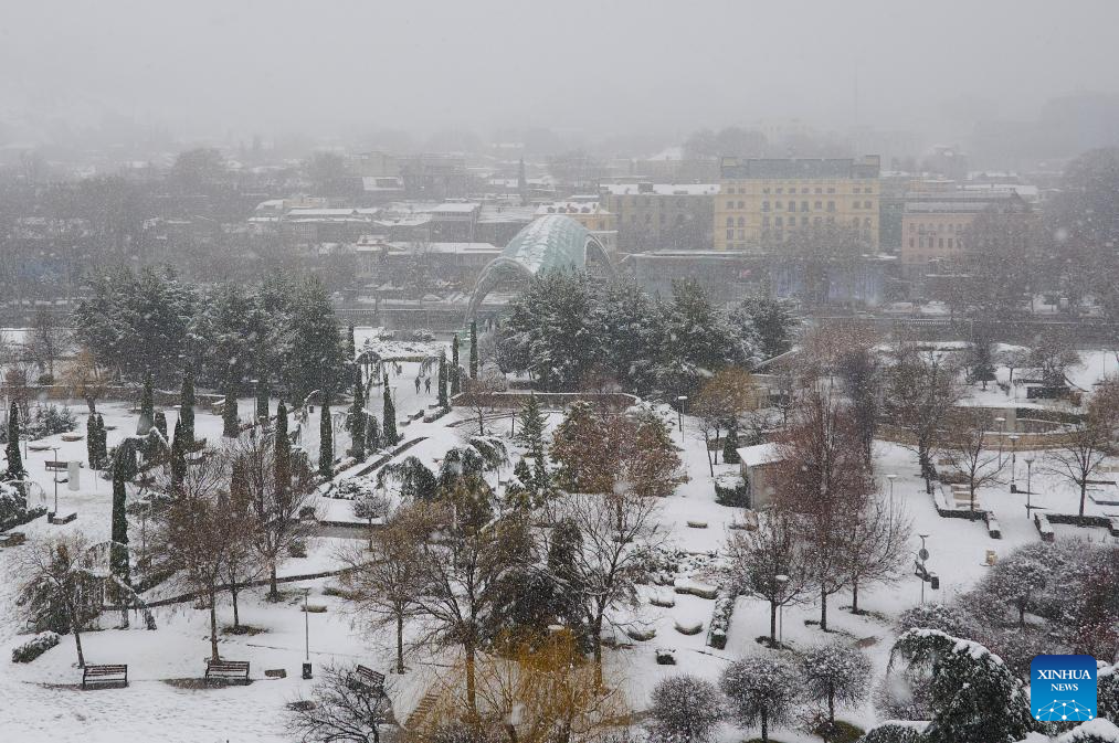 Photo taken on Jan. 19, 2026 shows snowy scenery in Rike Park in Tbilisi, capital of Georgia. (Photo by Alexander Imedashvili/Xinhua)