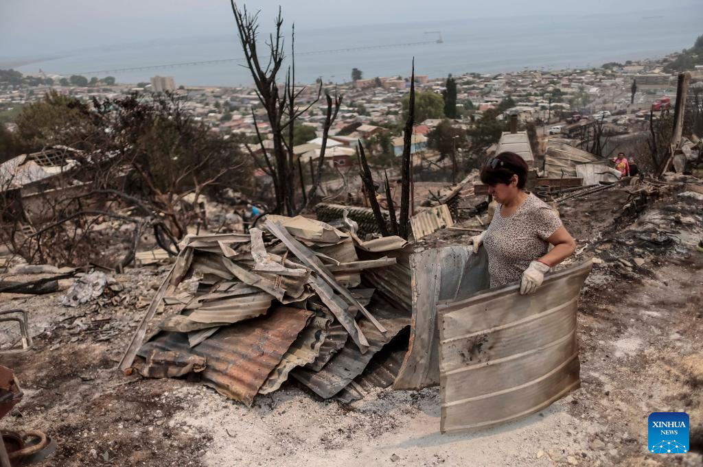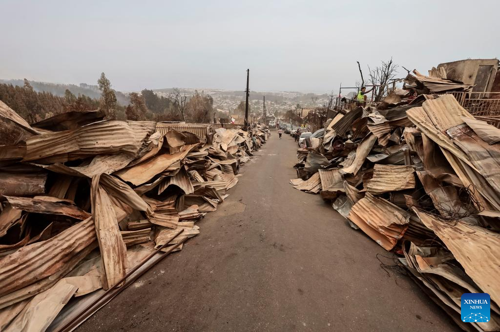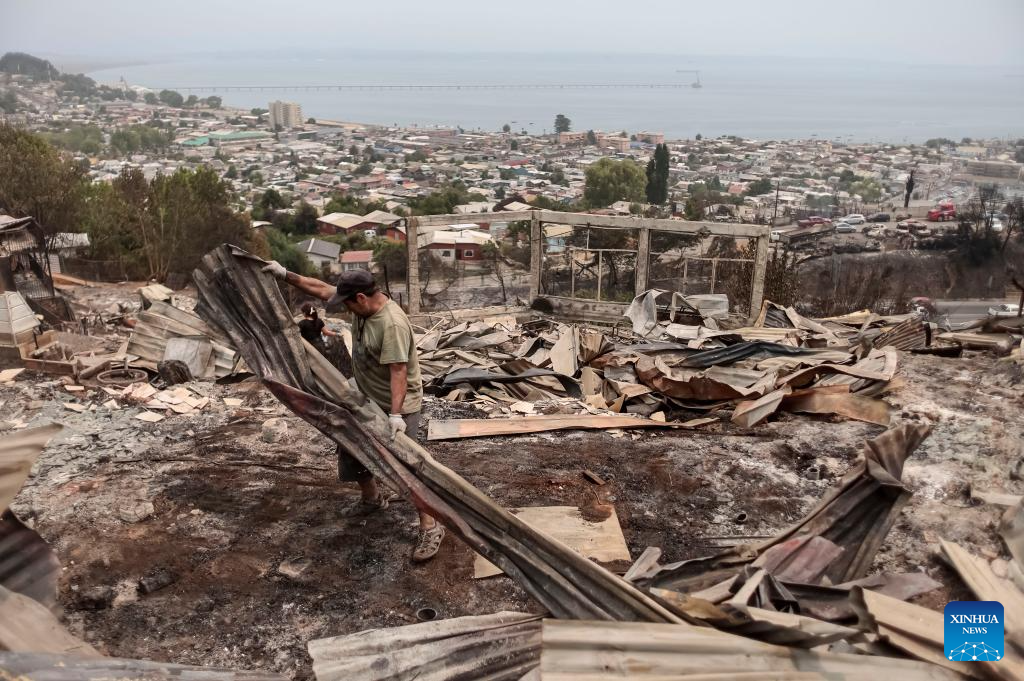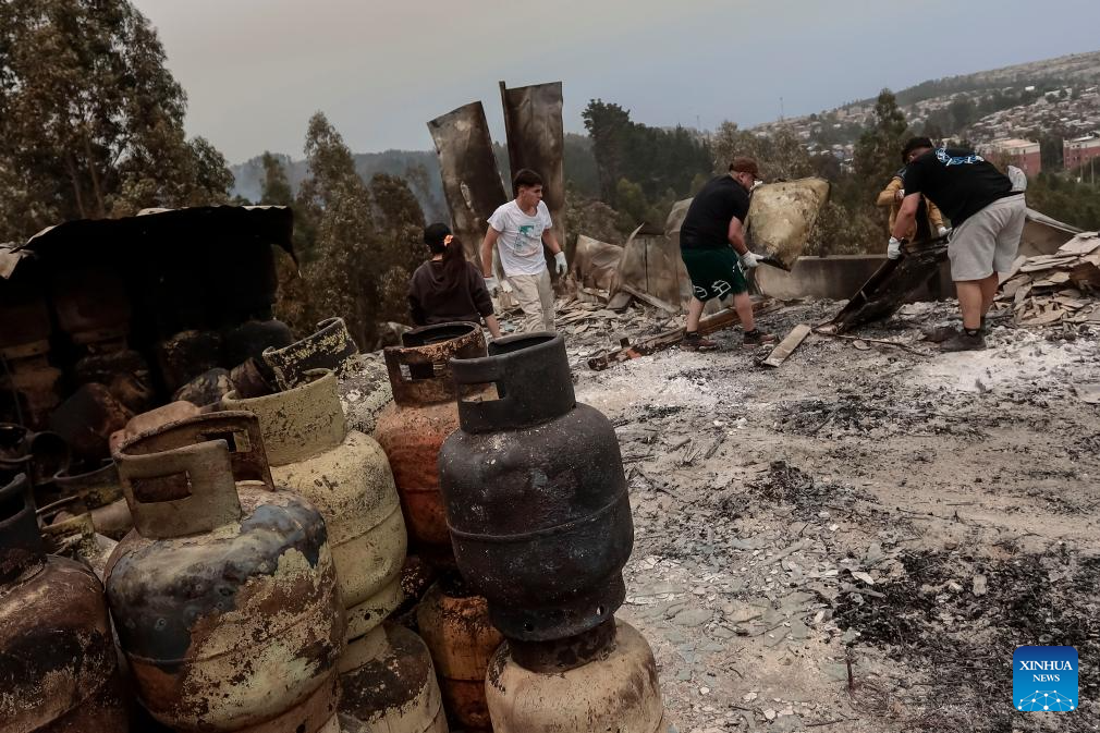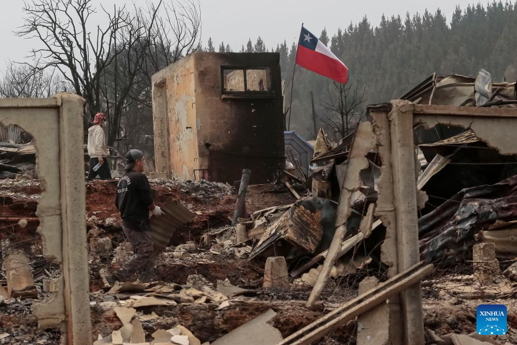 Residents clean a fire-affected area in Penco, Biobio region, Chile, Jan. 19, 2026. Chilean President Gabriel Boric has declared a state of catastrophe in the regions of Nuble and Biobio to address the emergency. (Str/Xinhua)