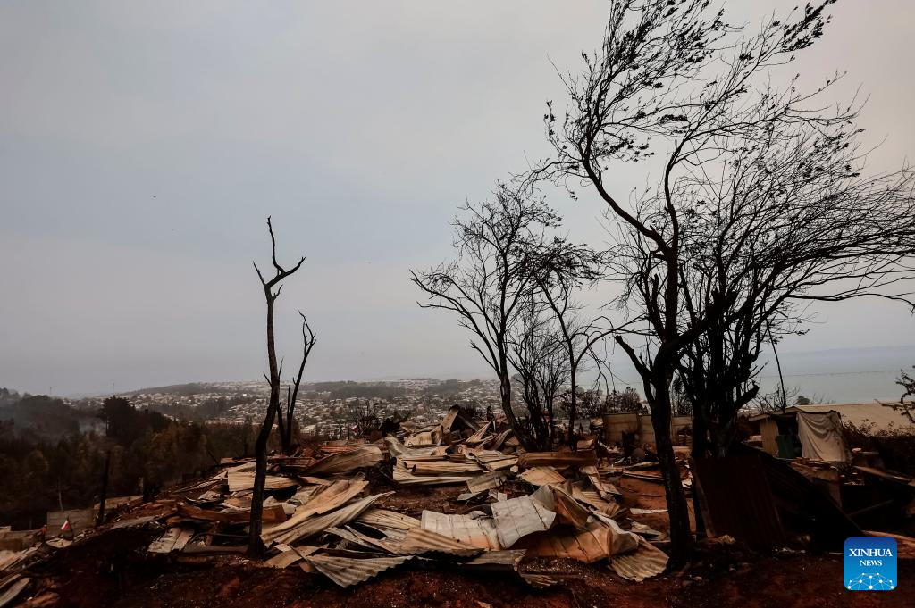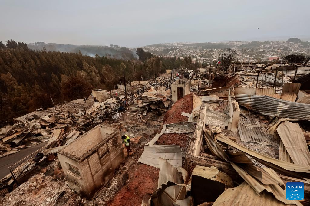 Photo taken on Jan. 19, 2026 shows a fire-affected area in Penco, Biobio region, Chile. Chilean President Gabriel Boric has declared a state of catastrophe in the regions of Nuble and Biobio to address the emergency. (Str/Xinhua)