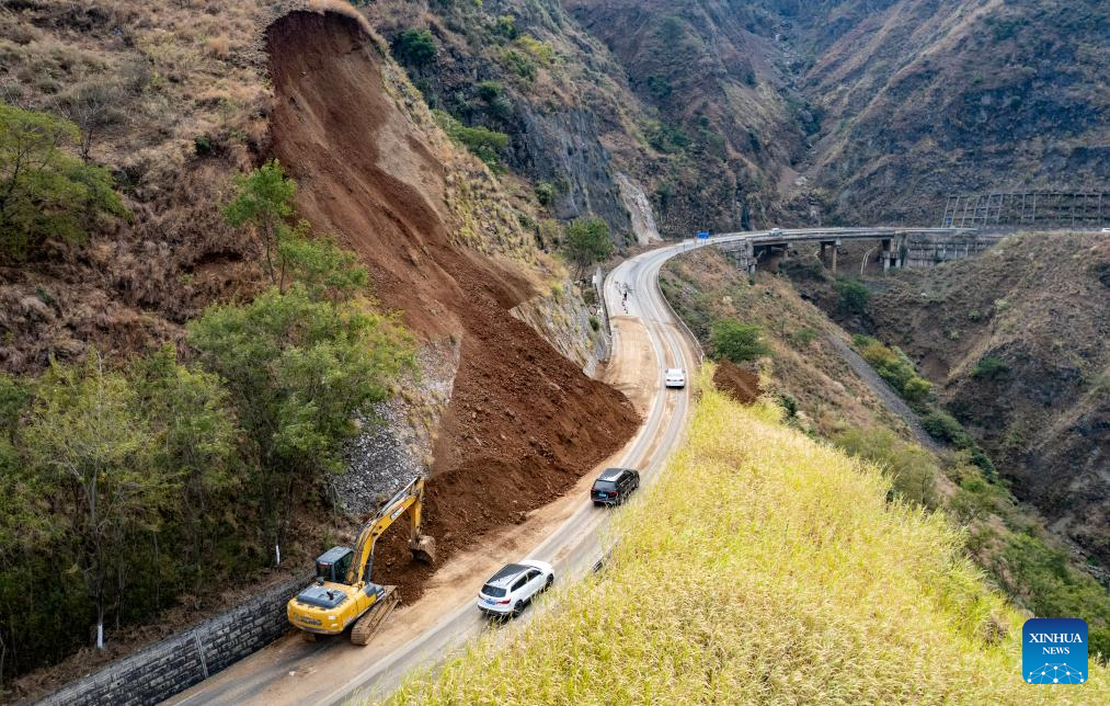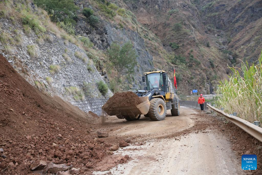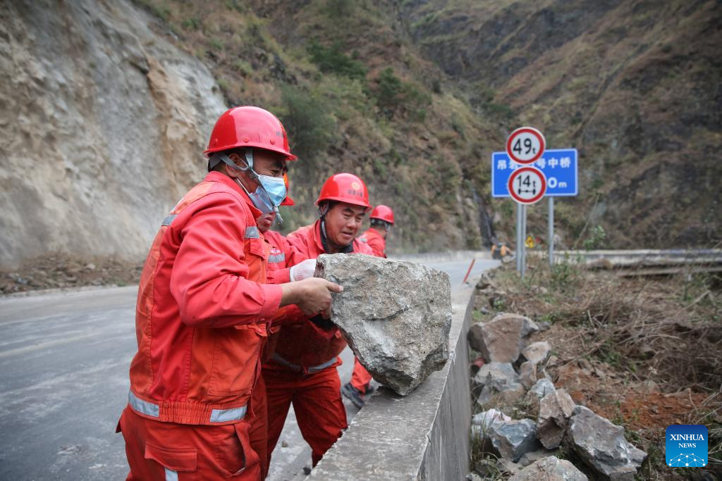 Workers clear a section of a road after an earthquake in Qiaojia County in southwest China's Yunnan Province, Jan. 20, 2026. (Photo by Yan Keren/Xinhua)
