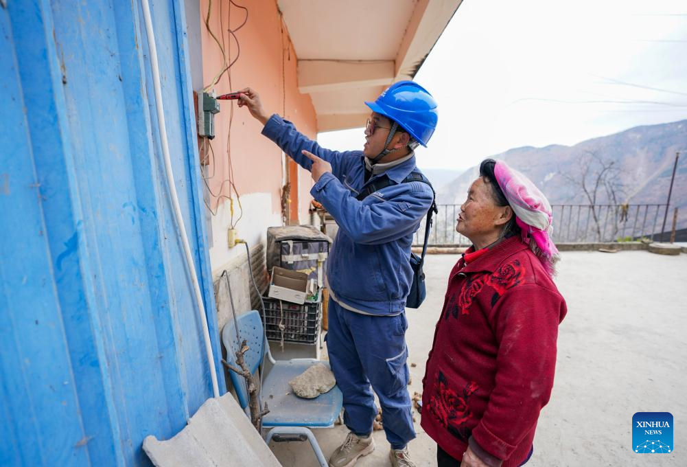 An electricity worker checks a power switch for a villager in Hongshiyan Village of Qiaojia County, southwest China's Yunnan Province, Jan. 20, 2026. (Xinhua/Chen Xinbo)