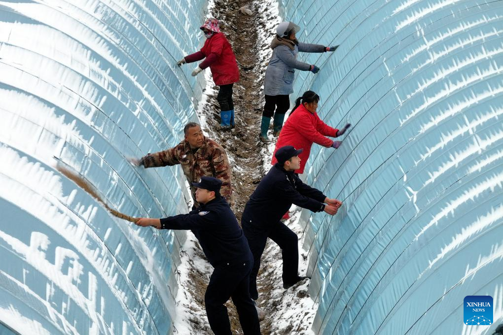 Police officers help farmers remove snow on greenhouses after a snowfall in Qianzhuang Village of Baoying County, east China's Jiangsu Province, on Jan. 19, 2026. (Photo by Shen Dongbing/Xinhua)