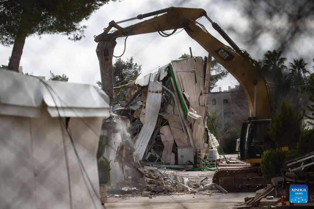 Israeli authorities demolish a building within the East Jerusalem compound of the United Nations Relief and Works Agency for Palestine Refugees (UNRWA) on Jan. 20, 2026. Israeli authorities on Tuesday demolished several buildings within the East Jerusalem compound of the UNRWA, an action that drew immediate and sharp condemnation from the UN body.