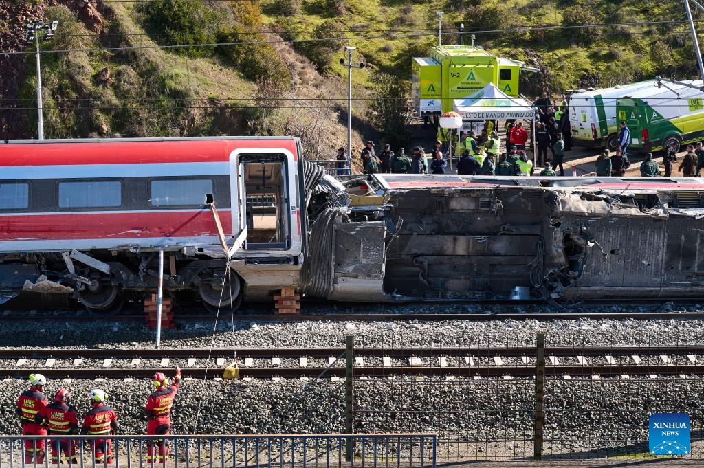 Rescuers work at the high-speed train collision site near Adamuz, in Cordoba, Spain, Jan. 20, 2026. Two high-speed trains collided in Cordoba Province in southern Spain on January 18, causing heavy casualties. (Xinhua/Meng Dingbo)