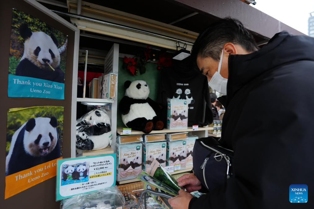A visitor chooses souvenirs inspired by giant pandas Xiao Xiao and Lei Lei at Ueno Zoo in Tokyo, Japan, Dec. 25, 2025. Giant pandas Xiao Xiao and Lei Lei, currently residing at a zoo in Tokyo, will depart for China on Jan. 27, marking the first time in about half a century that Japan will be without any pandas, local media reported. (Xinhua/Jia Haocheng)