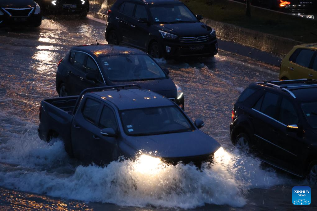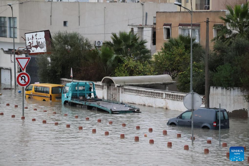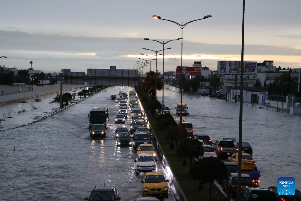 Vehicles pass through a flooded road in Tunis, Tunisia, Jan. 20, 2026. At least four people have been killed in Tunisia as the heaviest rainfall since 1950 caused flooding in the country, the state-run Tunis Afrique Presse (TAP) reported Tuesday. (Xinhua/Zhou Haojin)