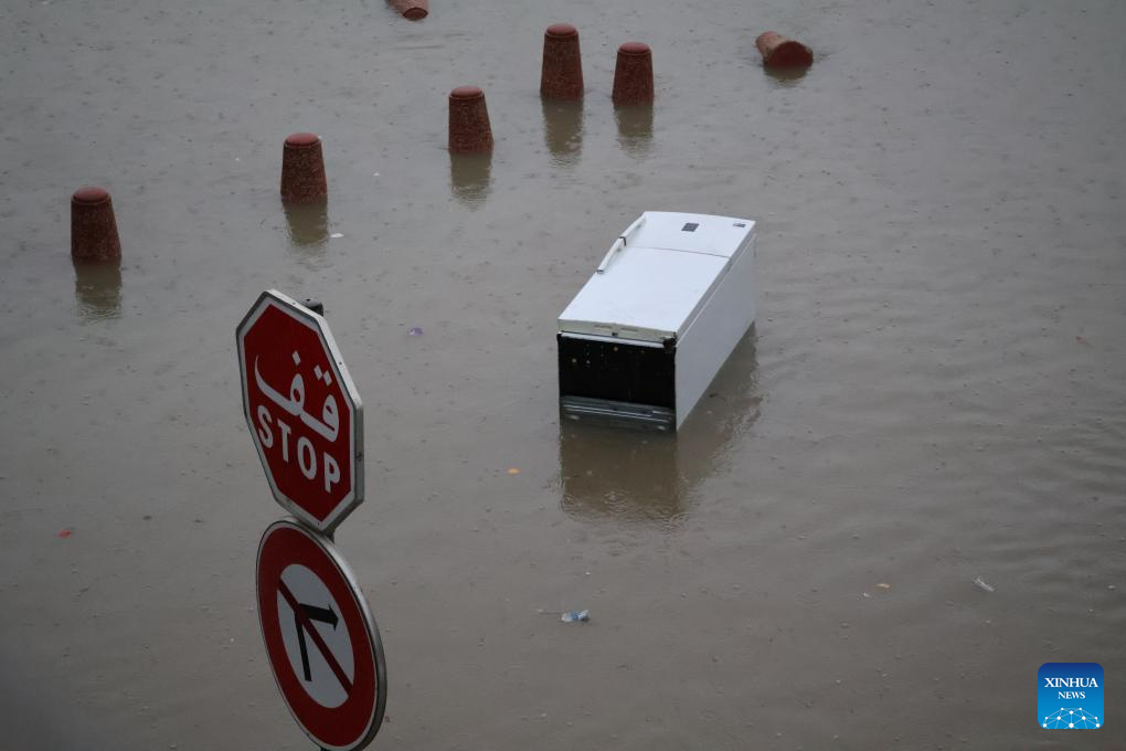 A refrigerator is seen floating on flood water in Tunis, Tunisia, Jan. 20, 2026. At least four people have been killed in Tunisia as the heaviest rainfall since 1950 caused flooding in the country, the state-run Tunis Afrique Presse (TAP) reported Tuesday. (Xinhua/Zhou Haojin)