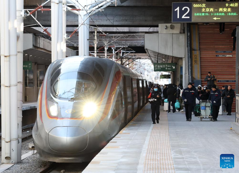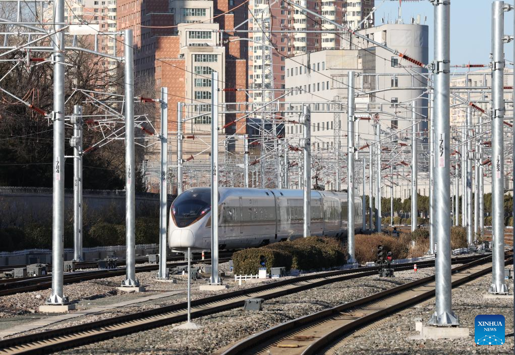 A bullet train pulls out of the Beijing West Railway Station in Beijing, capital of China, on Jan. 21, 2026. The Beijing West Railway Station marked its 30th anniversary on Wednesday. Over the past three decades, this modern transport hub has handled more than 1.96 billion passenger trips, standing as a witness to China's development and the evolution of its railway network. (Xinhua/Zhang Chenlin)