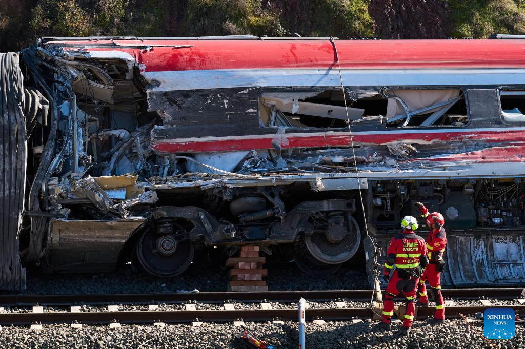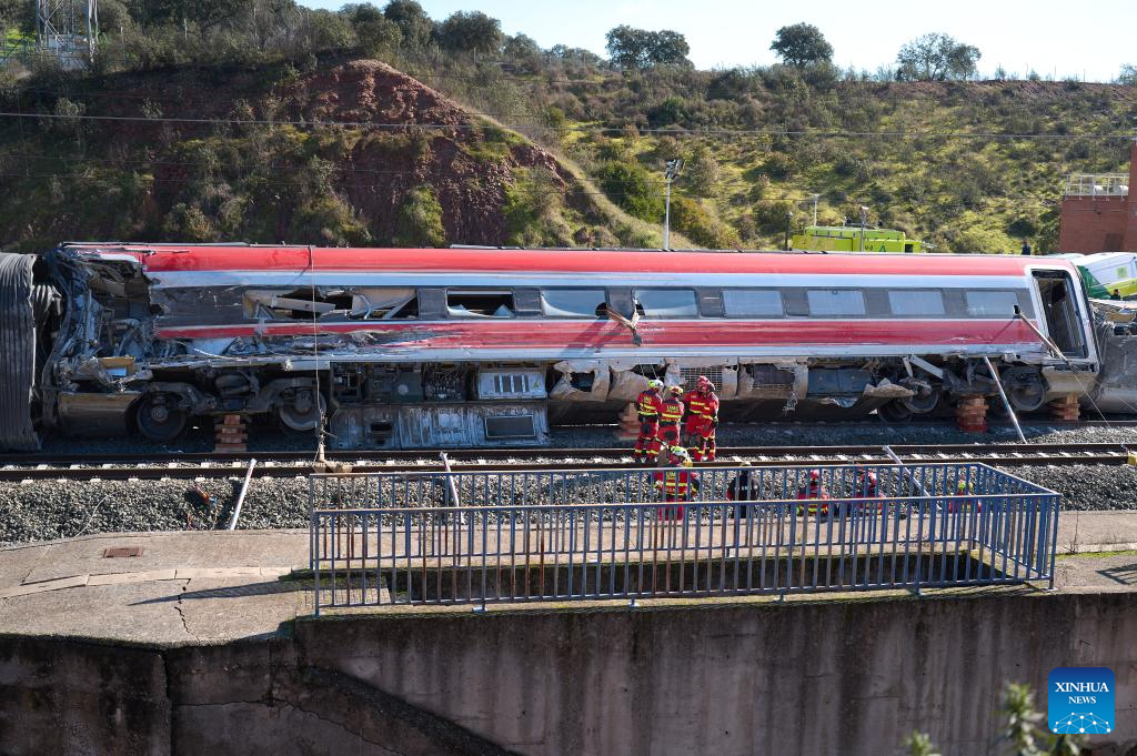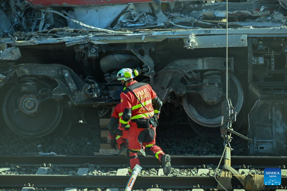 Rescuers work at the high-speed train collision site near Adamuz, in Cordoba, Spain, Jan. 20, 2026. Two high-speed trains collided in Cordoba Province in southern Spain on January 18, causing heavy casualties. (Xinhua/Meng Dingbo)