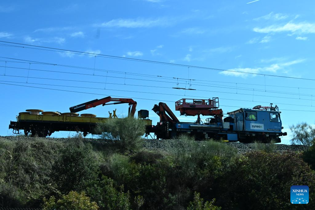 Heavy machinery heads to the high-speed train collision site near Adamuz, in Cordoba, Spain, Jan. 20, 2026. Two high-speed trains collided in Cordoba Province in southern Spain on January 18, causing heavy casualties. (Xinhua/Cheng Min)