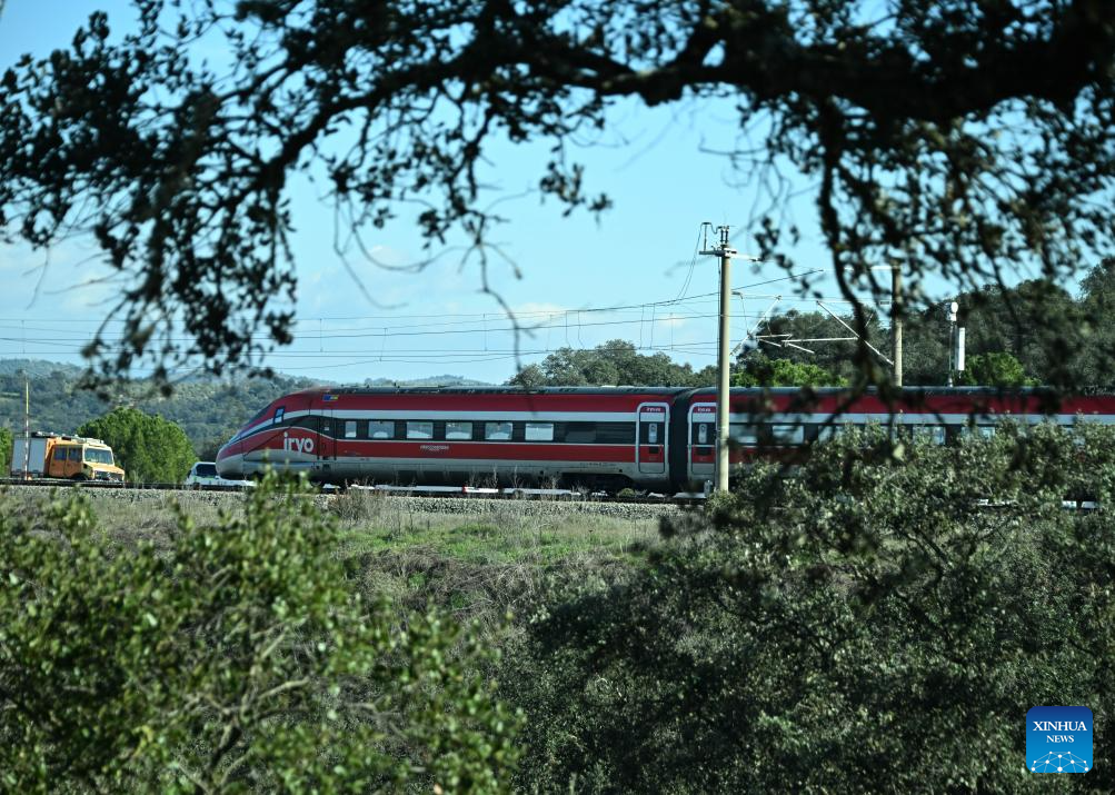 Photo taken on Jan. 20, 2026 shows a train at the high-speed train collision site near Adamuz, in Cordoba, Spain. Two high-speed trains collided in Cordoba Province in southern Spain on January 18, causing heavy casualties. (Xinhua/Meng Dingbo)