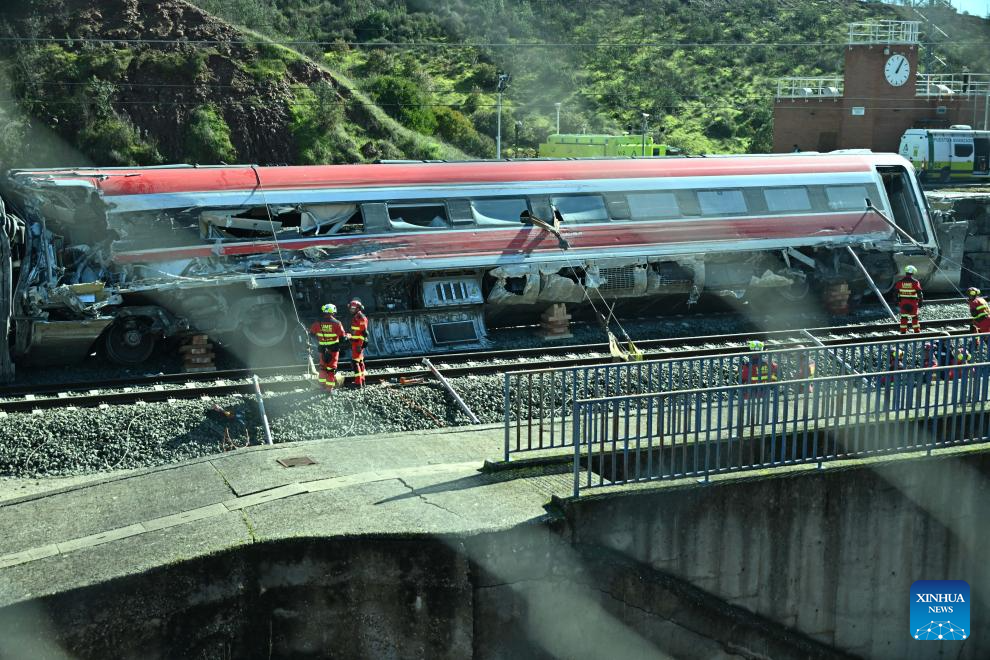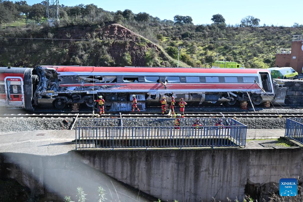 Rescuers work at the high-speed train collision site near Adamuz, in Cordoba, Spain, Jan. 20, 2026. Two high-speed trains collided in Cordoba Province in southern Spain on January 18, causing heavy casualties. (Xinhua/Cheng Min)