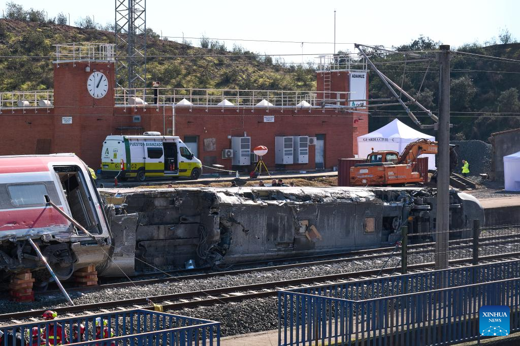 Train wreckage is pictured at the high-speed train collision site near Adamuz, in Cordoba, Spain, Jan. 20, 2026. Two high-speed trains collided in Cordoba Province in southern Spain on January 18, causing heavy casualties. (Xinhua/Meng Dingbo)