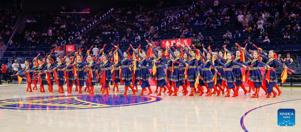 Performers dance to celebrate the upcoming Spring Festival, or the Chinese New Year, during the 2025-2026 NBA regular season basketball game between Golden State Warriors and Toronto Raptors in San Francisco, the United States, Jan. 20, 2026. (Photo by Arthur Dong/Xinhua)
